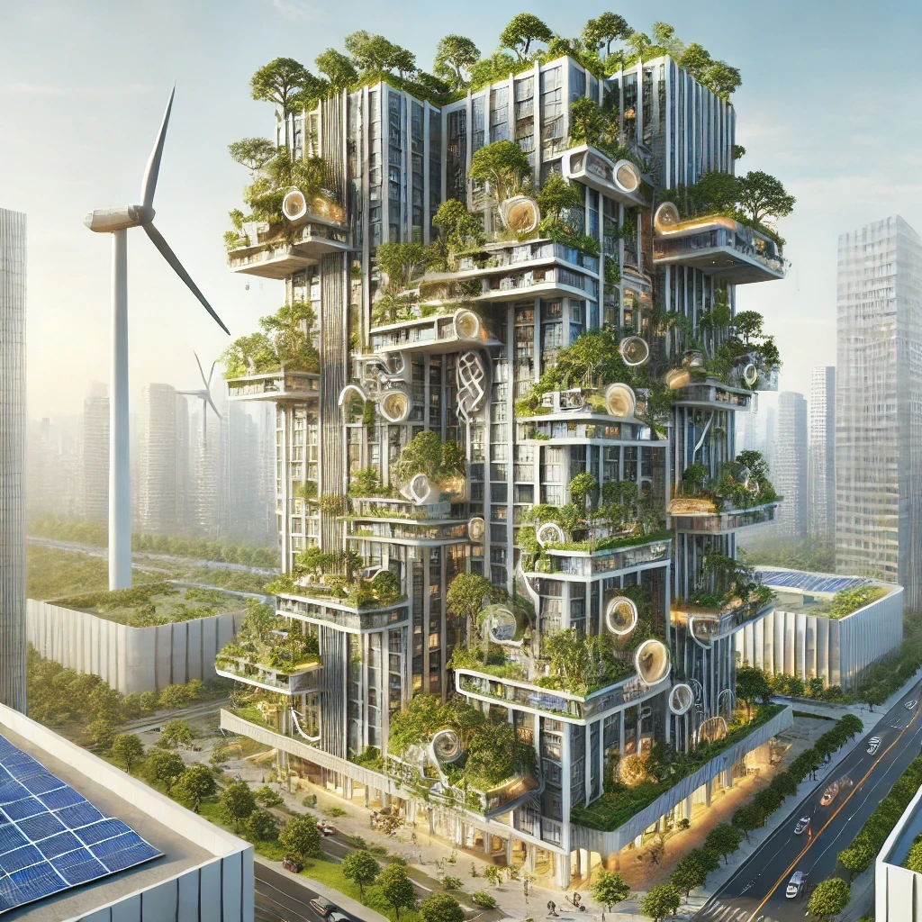 Wind turbines, vertical gardens, and solar-paneled facades.Case Study: