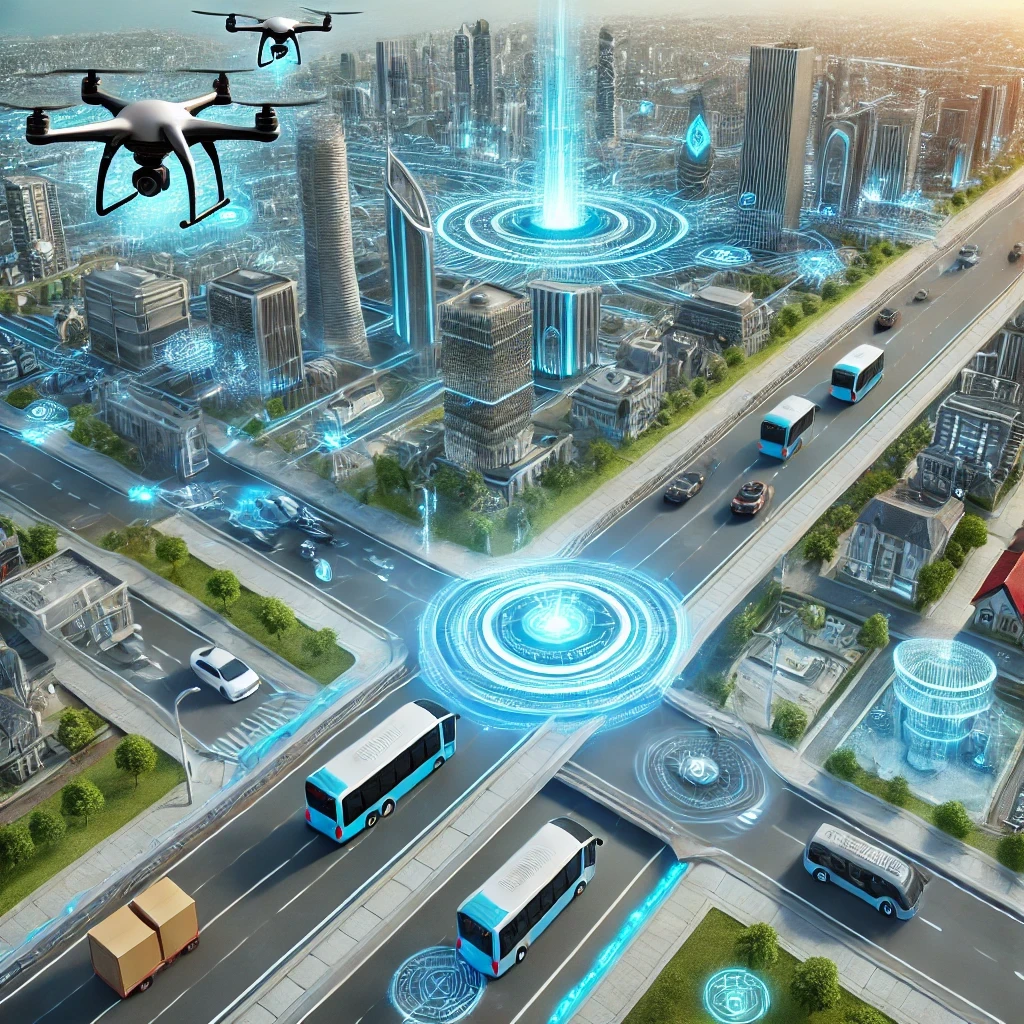 AI-powered elevators, drone delivery systems, and automated transport networks.Example: